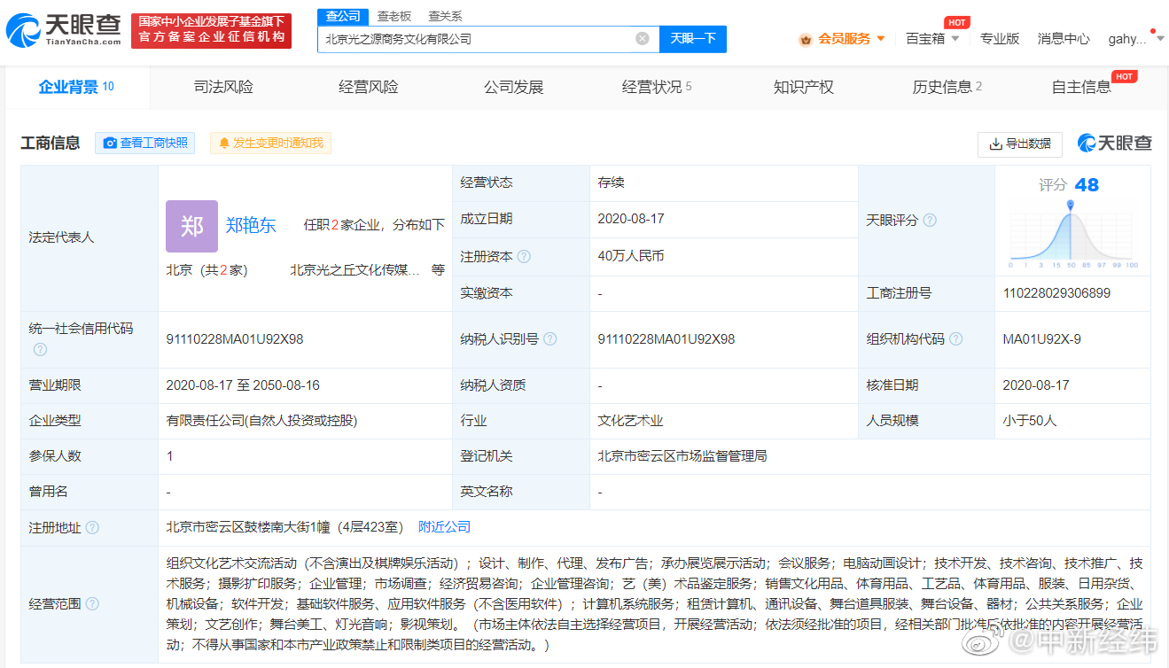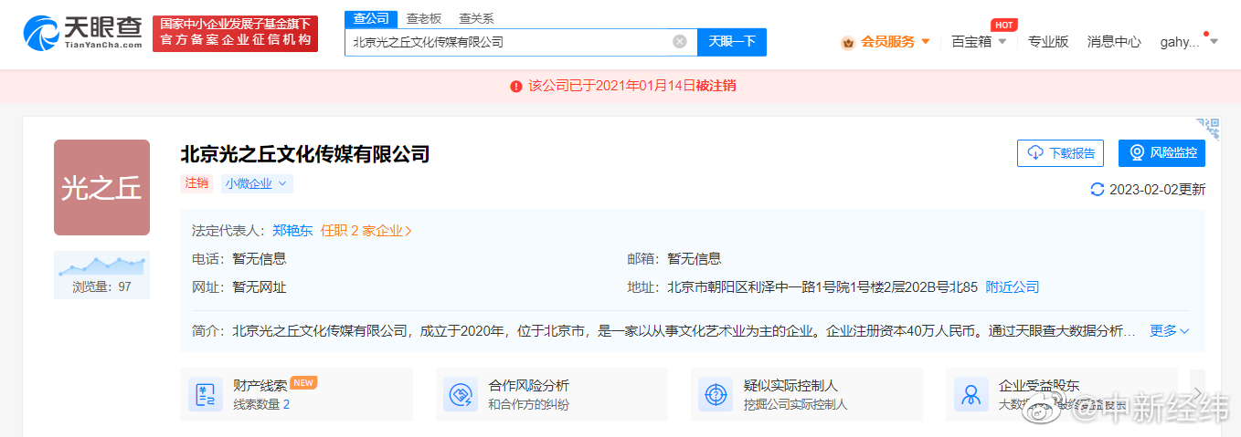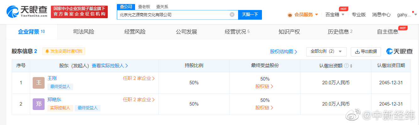 【#王刚工艺品鉴定公司已注销#】#王刚夫妻商务文化公司仅1人参保##王刚清空账号解散粉丝群#近日,有网友发现“和珅”的扮演者王刚将多个社交平台账号下的内容全部清空,并且解散了粉丝群。对此王刚回应称,因为实在没兴趣和精力去经营,加之与其无关却相似的账号有不少,所以清空了账号。天眼查App显示,王刚关联公司有2家,为北京光之源商务文化有限公司和北京光之丘文化传媒有限公司。其中北京光之源商务文化有限公司成立于2020年8月,注册资本40万人民币,法定代表人为郑艳东(王刚现任妻子),经营范围包含组织文艺交流活动、销售文化用品等,由王刚、郑艳东分别持股50%。2021年年报显示,该公司参保人数为1。北京光之丘文化传媒有限公司成立于2020年6月,注册资本40万人民币,经营范围包含工艺美术品鉴定服务等,同样由王刚夫妻共同持股,该公司已于2021年1月被注销。
